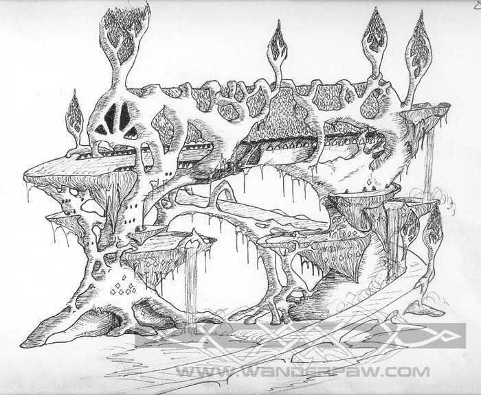 An ink drawing of a larger treehouse airport concept for a video game tree city.