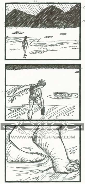 First of three pages for a simple storyboarded sequence. This shows a girl approaching a bay at extreme low tide. This location is based in real life, the bay is Mud Bay located in West Bremerton.